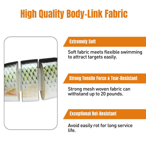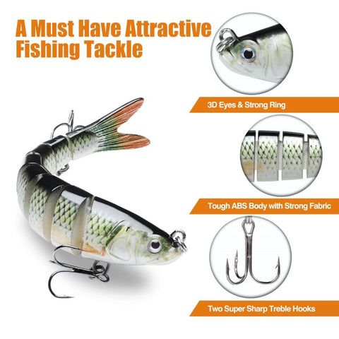 Designed with 8 segment multi-jointed body, TRUSCEND fishing lure can sink slowly and move flexible in water. In addition, life-like swimming actions make it attracting more catches and provoking predator fish to strike.With 3D realistic looking eyes and pearl powder coating, this swimbait appears very delicate and vivid that looks like a real fish. A perfect fishing bait that easily cheats the target fishes.